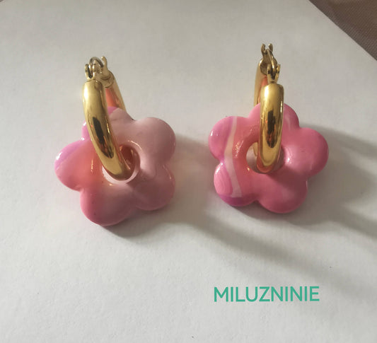 Boucles d'oreilles créoles en acier inoxydable avec pampilles (fleurs) roses en Fimo – faites main & interchangeables
