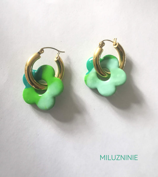 Boucles d'oreilles créoles en acier inoxydable avec pampilles (fleurs) vert en Fimo – faites main & interchangeables