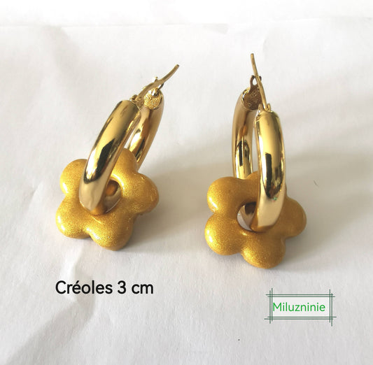 🌸 Boucles d’oreilles créoles dorées – Pampilles en Fimo faites main & interchangeables 🌸