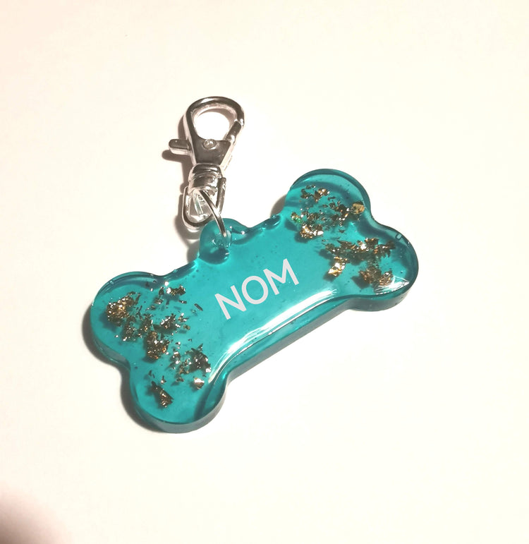 Médaille animaux personnalisée prénom – Forme os – Résine vert transparent avec feuille d’or – Accessoire animal – Cadeau unique (Copie)