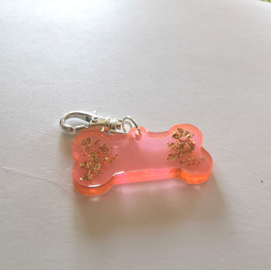 Médaille animaux personnalisée prénom – Forme os – Résine rose transparent avec feuille d’or – Accessoire animal – Cadeau unique