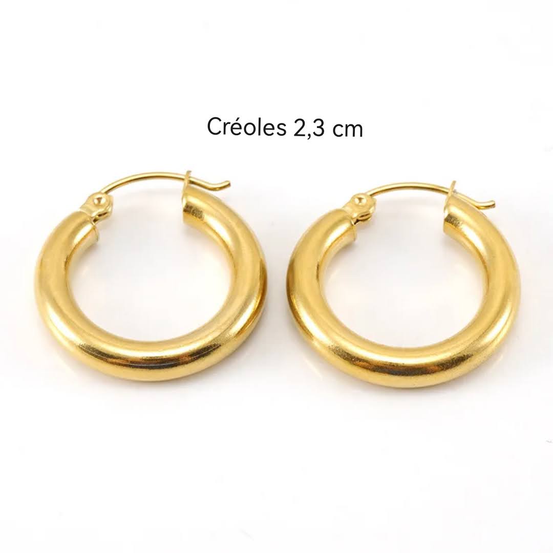 Créoles dorées 2,3 cm en acier inoxydable hypoallergénique. Élégantes, résistantes à l’eau et au temps, parfaites pour vos pampilles interchangeables.