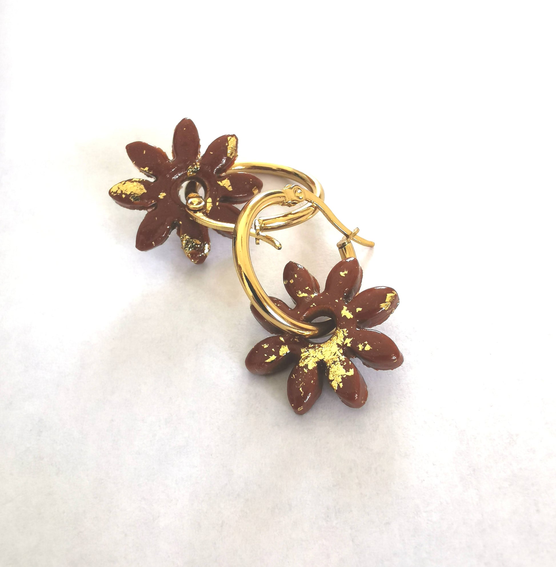 Ajoutez une touche florale et élégante à vos boucles d'oreilles grâce à ces pampilles en pâte polymère (Fimo), réalisées entièrement à la main. Leur belle teinte chocolat et or apporte fraîcheur et délicatesse à votre look.