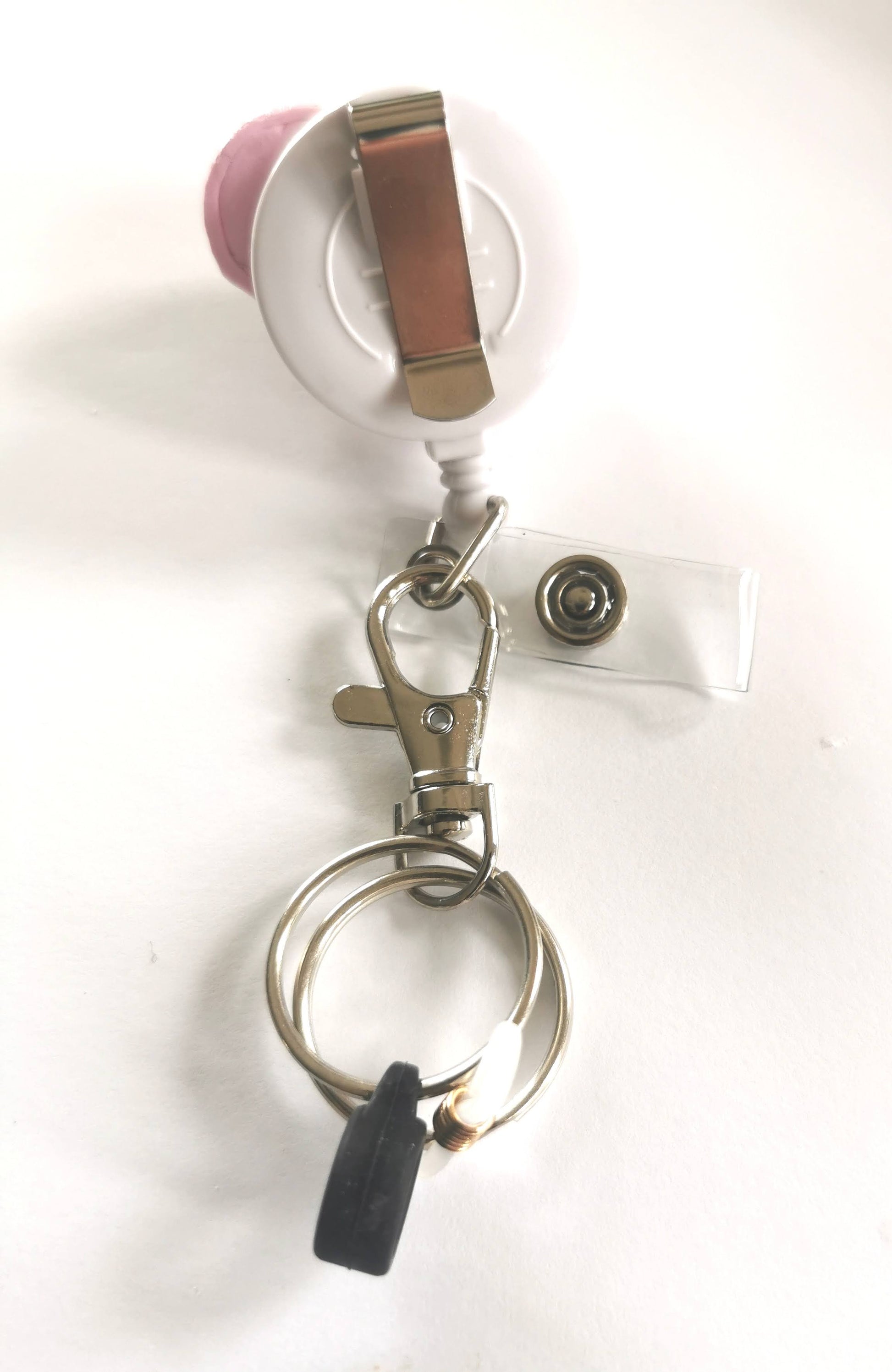 Porte-badge enrouleur avec porte-stylo – décoration Crocs rose en Fimo